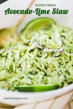 We put this avocado coleslaw on pulled pork, and it was excellent! I made the dressing and salted the cabbage the day before, left them separately covered in the fridge and then mixed them up before serving. There was just enough ‘kick’ to make it interesting and even our young grands had seconds. Thanks for making me look good!