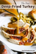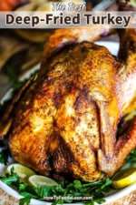 Air-Chill – Start early. You’ll need to give yourself a few days to allow the bird to defrost (if frozen) in the refrigerator. See NOTES on how to thaw the bird faster. Make the rub and apply it all over the turkey. Inject the marinade as instructed. Then, place on a baking rack on a baking pan and place in the fridge for at least 4 hours if possible, even better is overnight! This helps the skin get slightly crispy during the frying process.