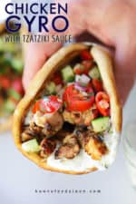 - Remove the warmed pitas from the oven. Build the gyros by adding about 1 tablespoon of the tzatziki sauce first, then a layer of chicken, topped with about a ¼ cup of cucumber topping, and then a little more tzatziki on top, if desired.