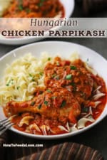 The deep red sauce may make you think it is spicy, but it’s not unless you go with hot paprika or a combination of sweet and hot. Seek out Hungarian sweet paprika and you will not be disappointed. This can be made with bone-in chicken pieces or boneless chicken pieces. Serve over egg noodles or homemade spaetzle!