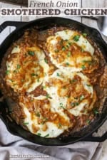 This One-Pan French Onion Smothered Chicken is a total “knock-out” meal, featuring juicy chicken breasts topped with deeply caramelized onions and a bubbly, double-cheese blanket. For the ultimate comfort food experience, serve this restaurant-quality dish alongside buttery homemade mashed potatoes and a side of crisp green beans almondine.
