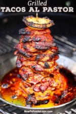 We use our tacos al pastor skewer (with plate) to grill the meat. You can also use wooden or metal skewers that you insert into the bottom slice of the pineapple to secure the meat. Or, you can simply grill the strips of marinated pork directly on the grill until crispy on the edges and fully cooked (about 15 to 20 minutes).