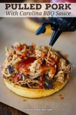 - Step 8: Place a mound of the pulled pork on a toasted bun bottom and top that with Carolina BBQ sauce, coleslaw, and the top bun.