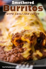 Other fillings or toppings: In addition to beef, we love making this with chicken tinga. For a Cal-Mex version, include Mexican rice along with guacamole. As mentioned, instead of chili con carne, homemade queso is also wonderful for smothering the burritos.