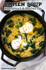 - Use a slotted spoon to transfer the poached eggs to the pot of ramen, or ladle out the soup into soup bowls and top each with one of the poached eggs.